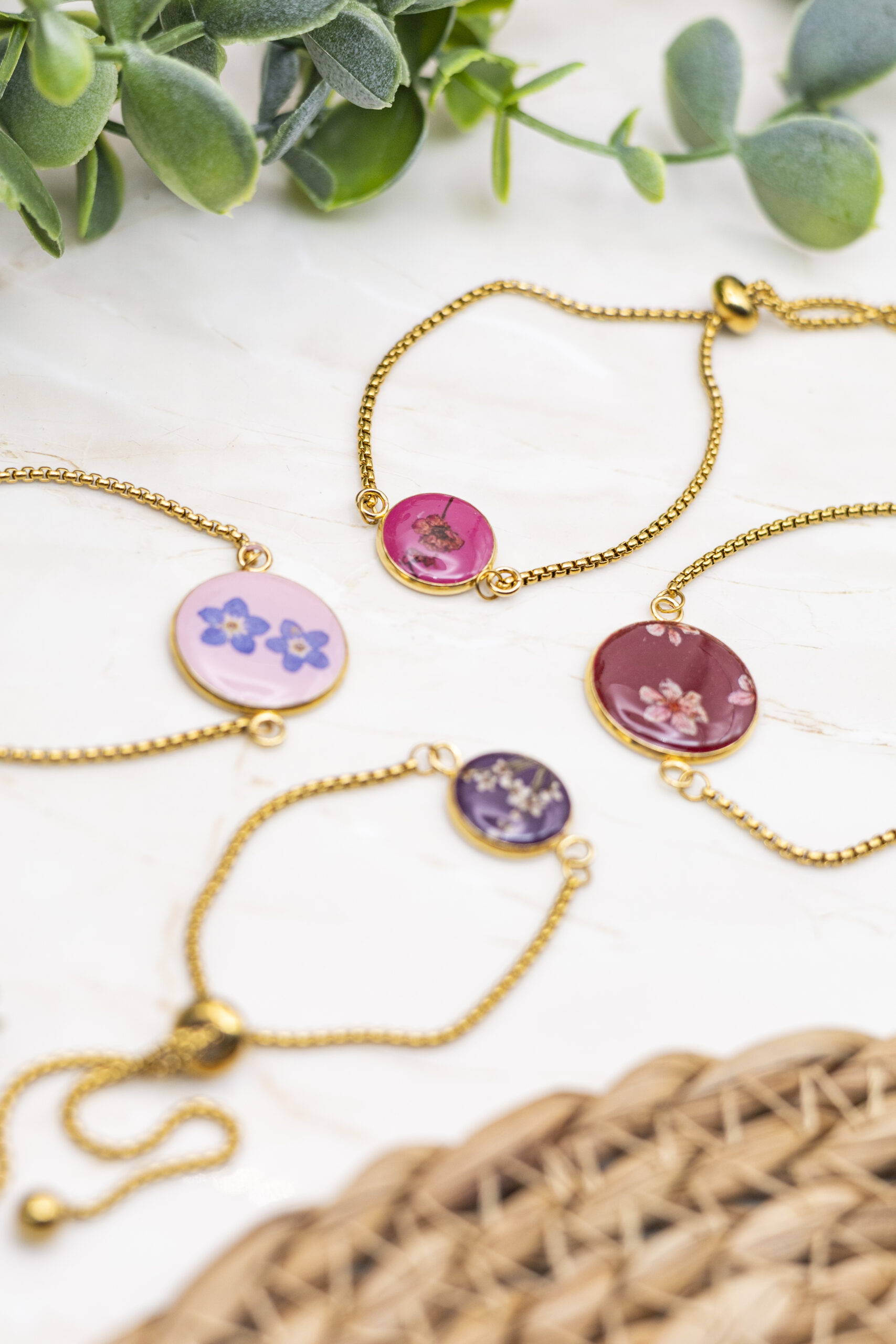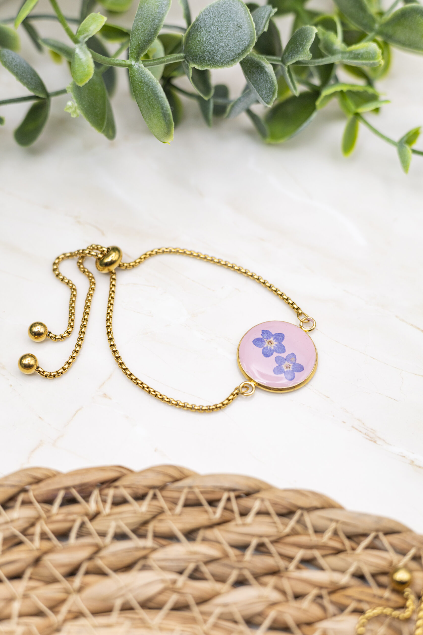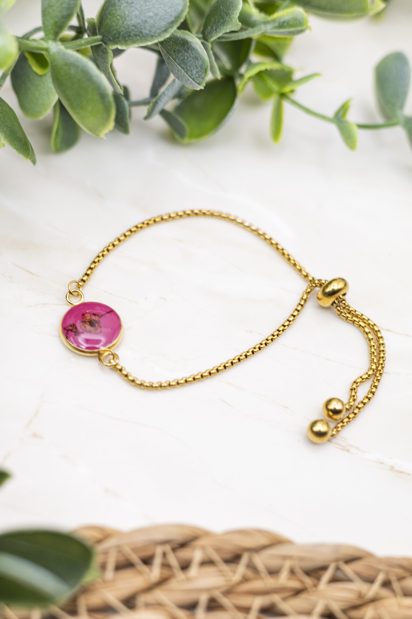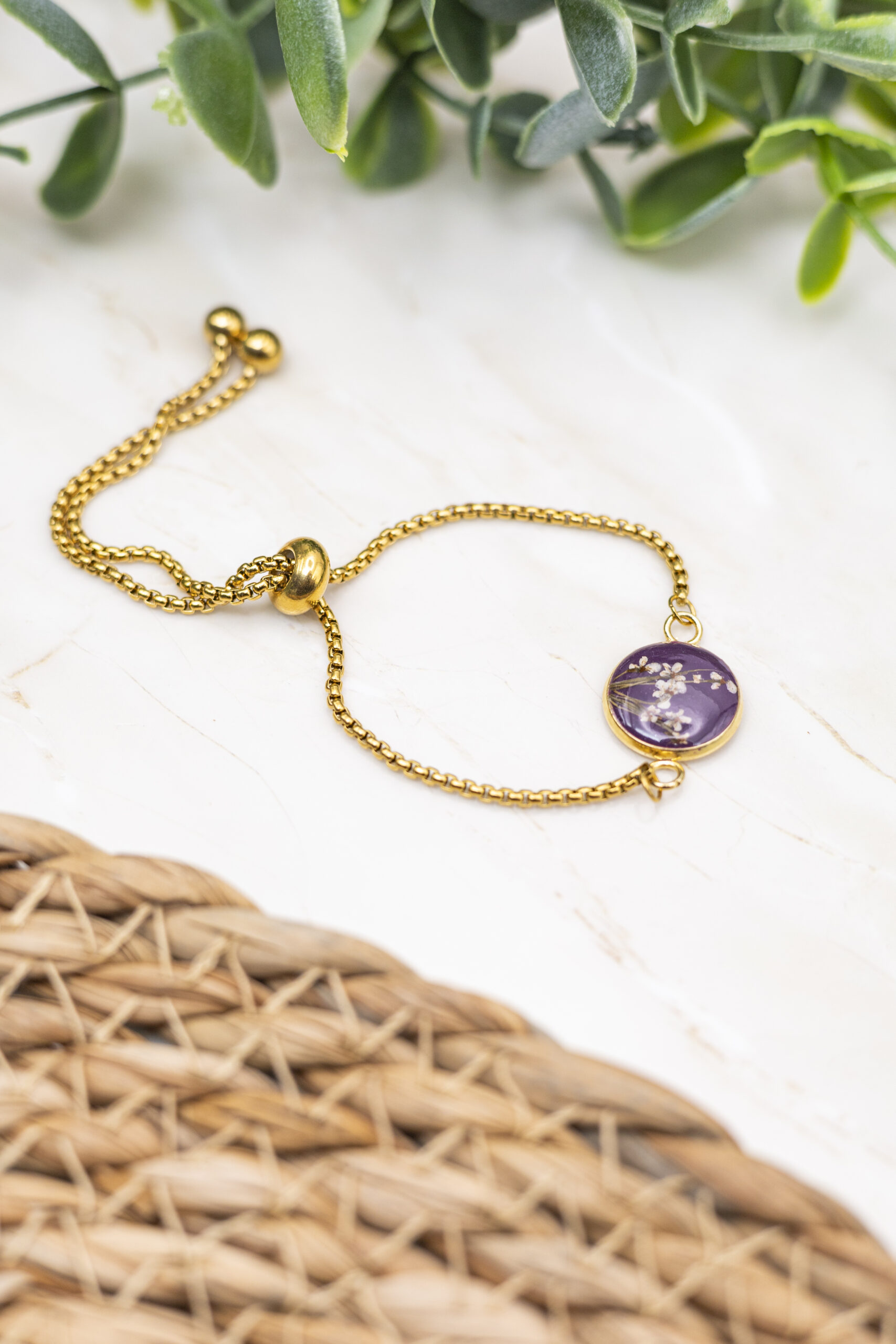 Toute la chaine ainsi que le pendentif sont en acier inoxydable plaqué or. L’intérieur du pendentif est en argile polymère et résine UV.